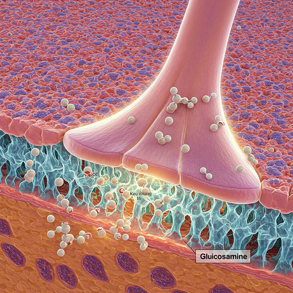 글루코사민은 연골의 주성분인 글리코사미노글리칸 합성에 관여하여 연골 유지 및 회복에 기여합니다.