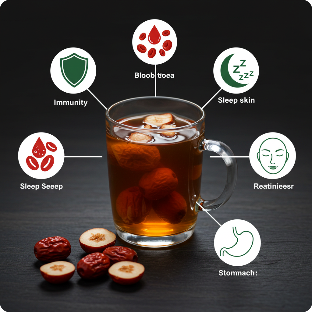 대추차의 비타민C와 폴리페놀은 체내 면역세포를 활성화시켜 감기나 바이러스 감염 예방에 도움을 줍니다.