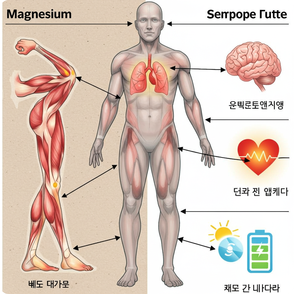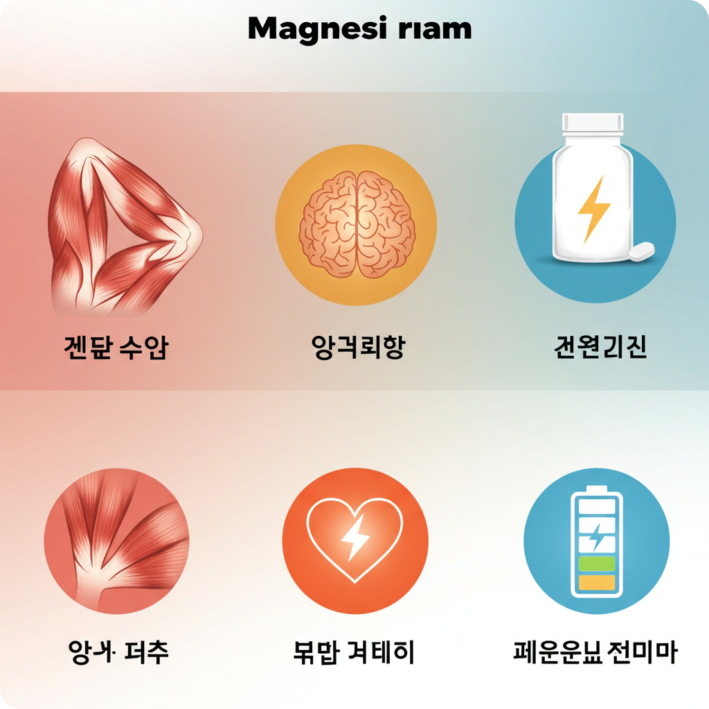 마그네슘은 우리 몸의 300여 가지 효소 반응에 관여하는 필수 미네랄로, 에너지 대사·근육 이완·신경 안정·혈압 조절 등 다양한 기능을 합니다.