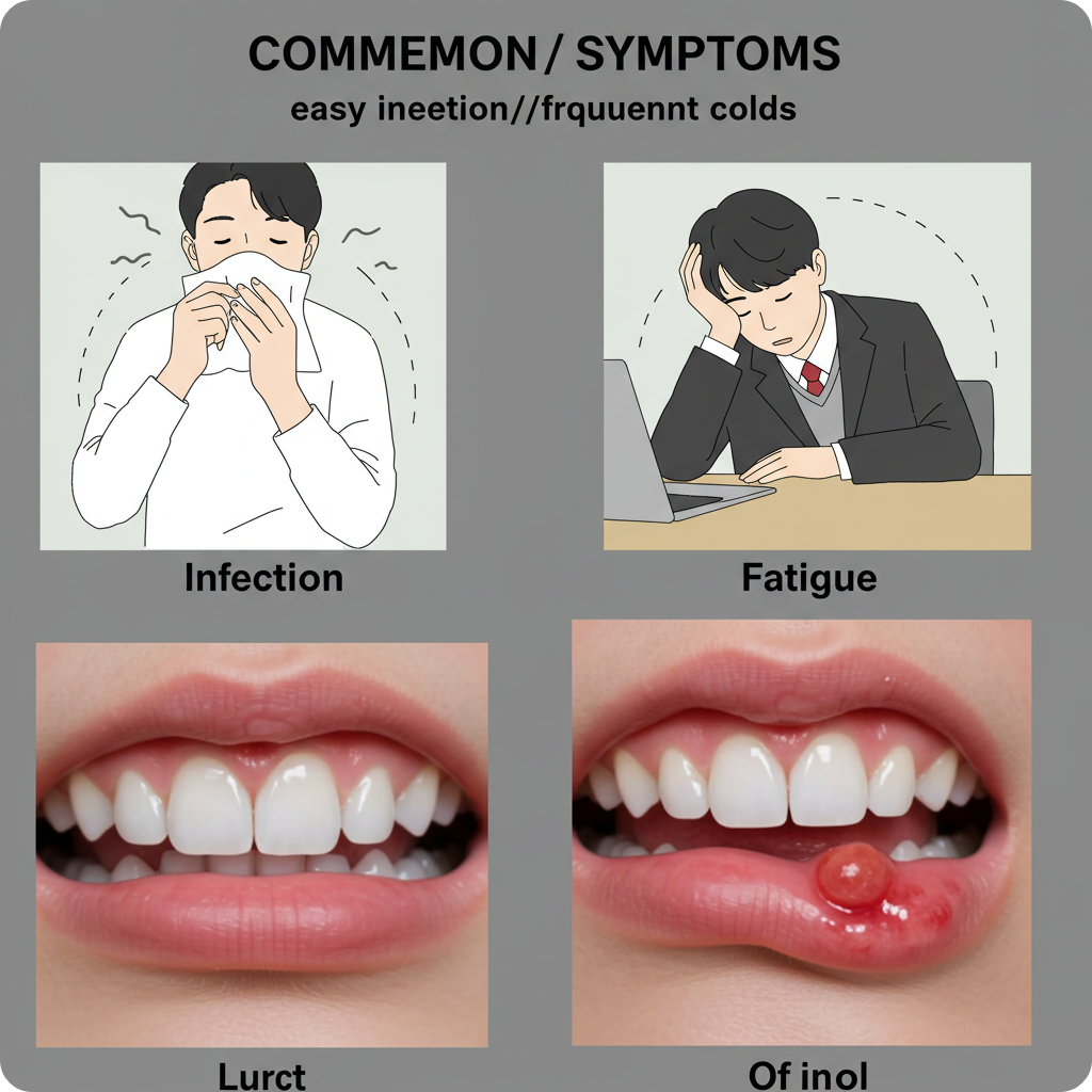 백혈구가 부족할 때는 구내염, 잇몸 염증, 여드름, 종기 등이 자주 발생할 수 있습니다.