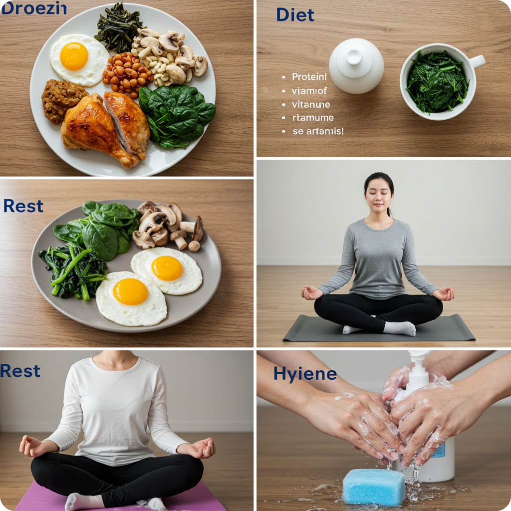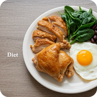 단백질이 풍부한 육류·달걀·콩류와 비타민B군, 아연, 철분이 함유된 식품을 충분히 섭취하세요.
