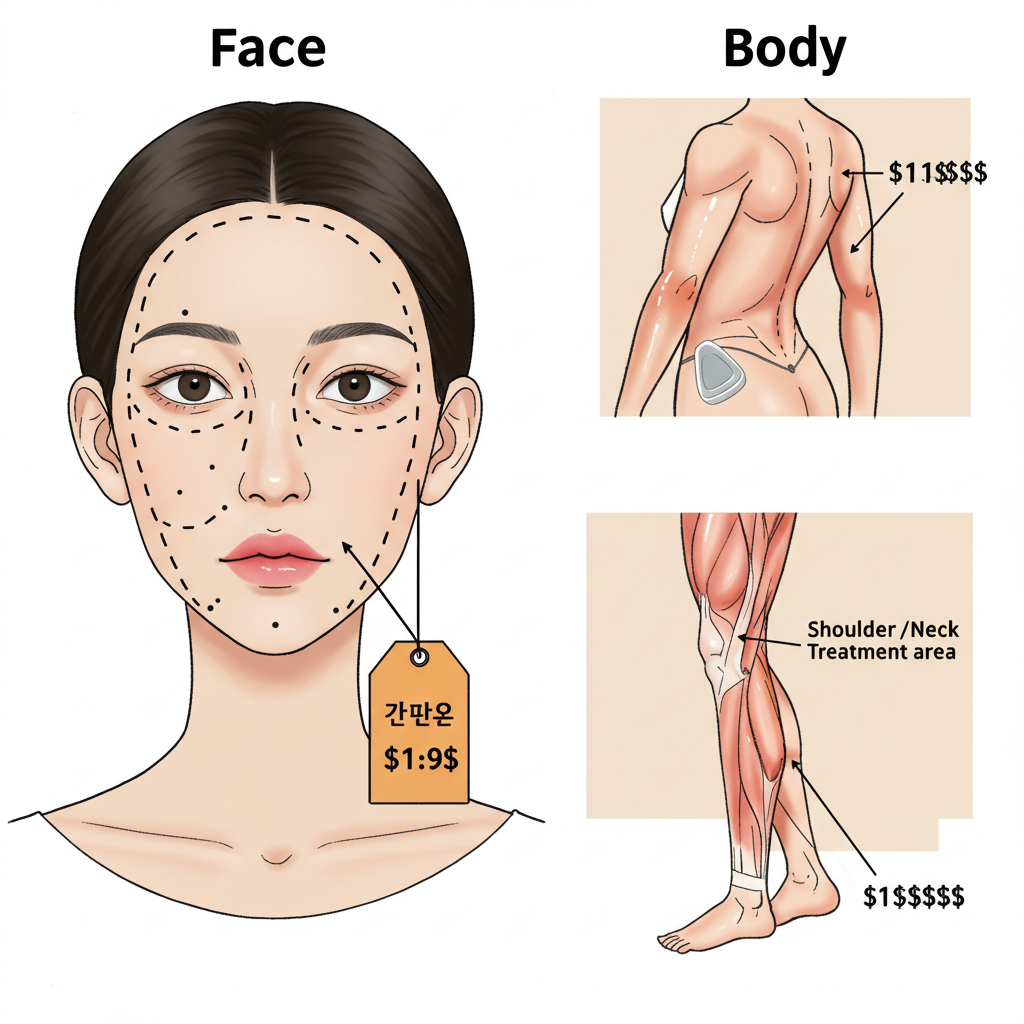 넓은 부위나 근육이 두꺼운 부위는 단위(U) 소모가 많아 보톡스 가격이 높습니다. 또한 개인 근육 비대칭 교정을 위해 맞춤 도수 조정이 필요할 경우, 추가비가 발생할 수 있습니다.