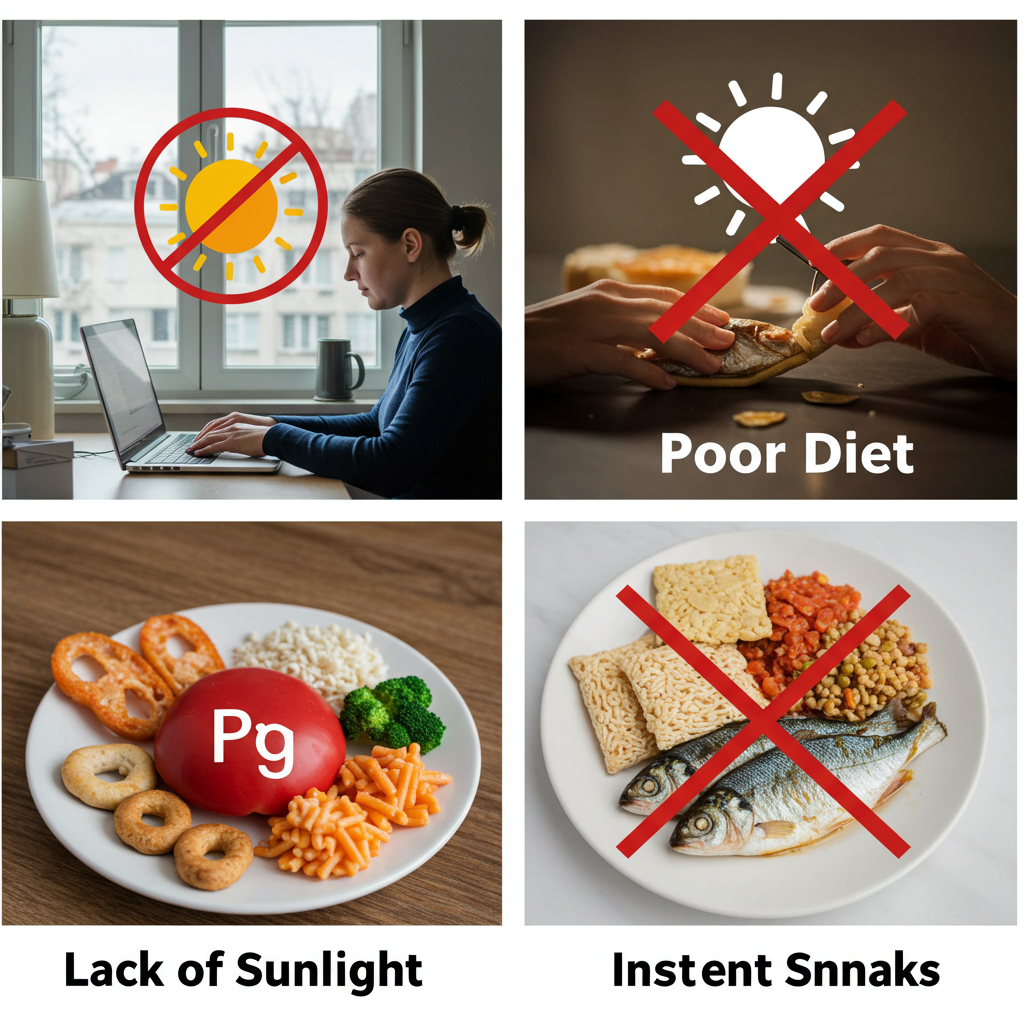 비타민D는 피부가 햇빛을 받아 합성되는데, 실내 생활 위주인 현대인들은 햇빛 노출이 부족해 결핍이 흔히 나타납니다.