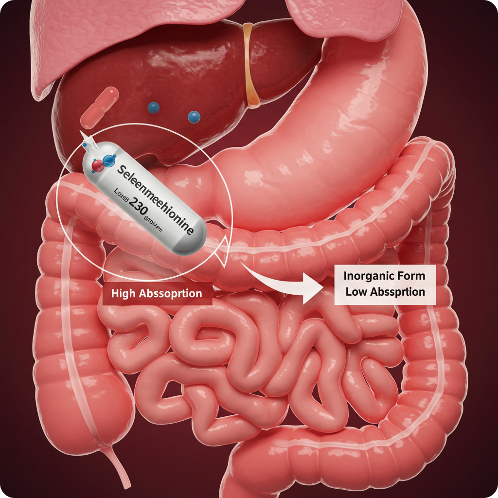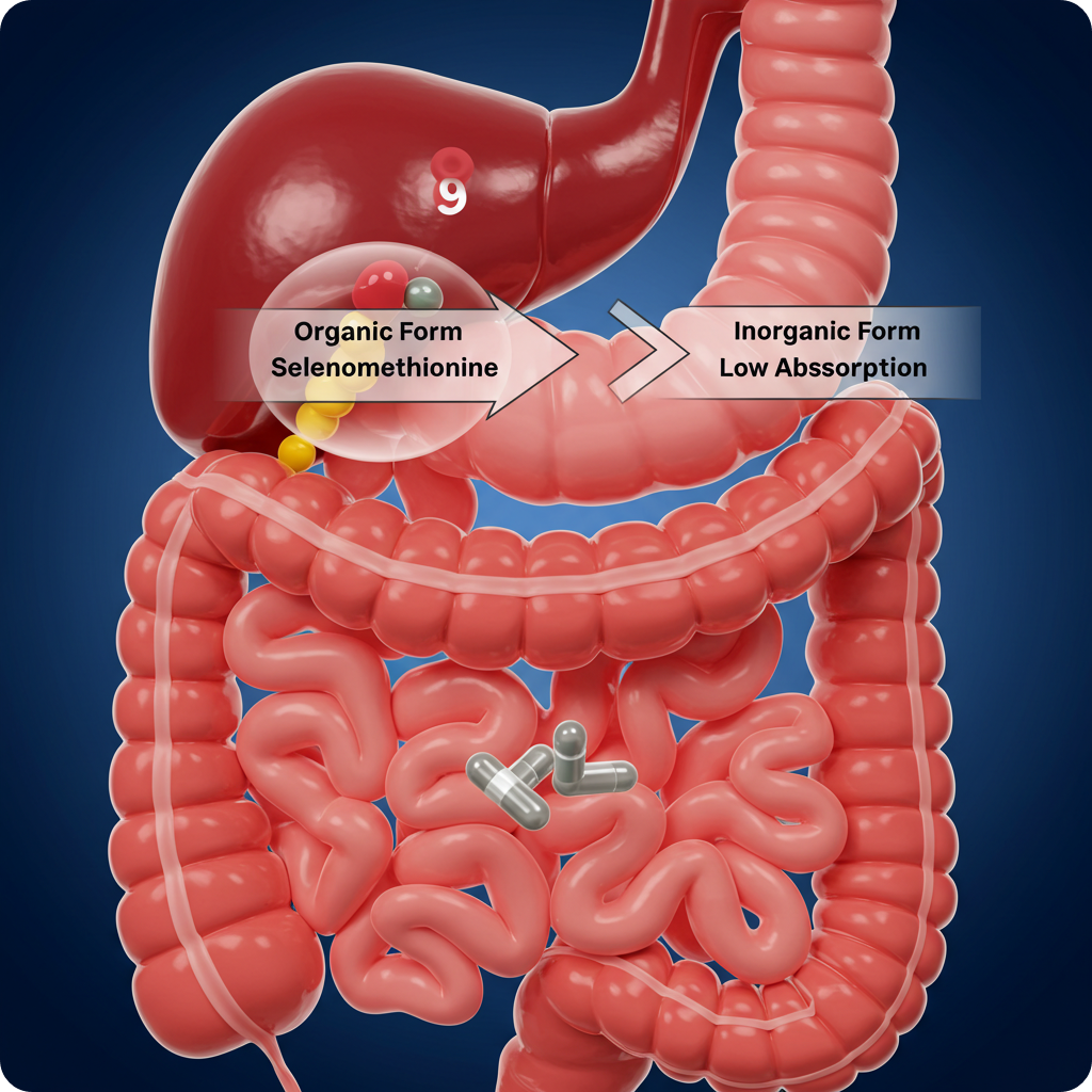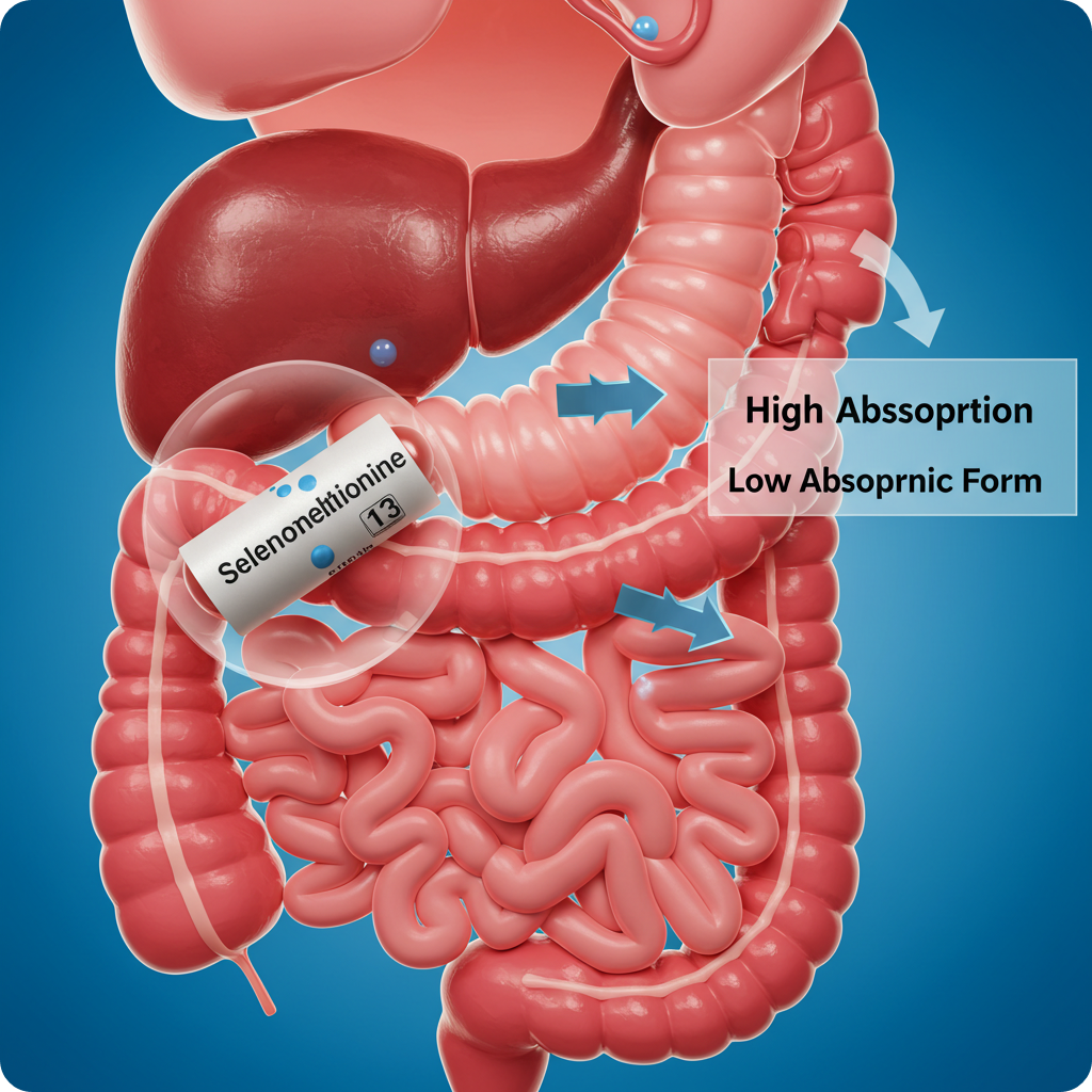 유기 형태(셀레노메티오닌, 셀레노시스테인)는 체내 흡수율이 높아 일반적으로 선호됩니다. 무기 형태(셀레네이트, 셀레나이트)는 흡수율이 낮습니다.