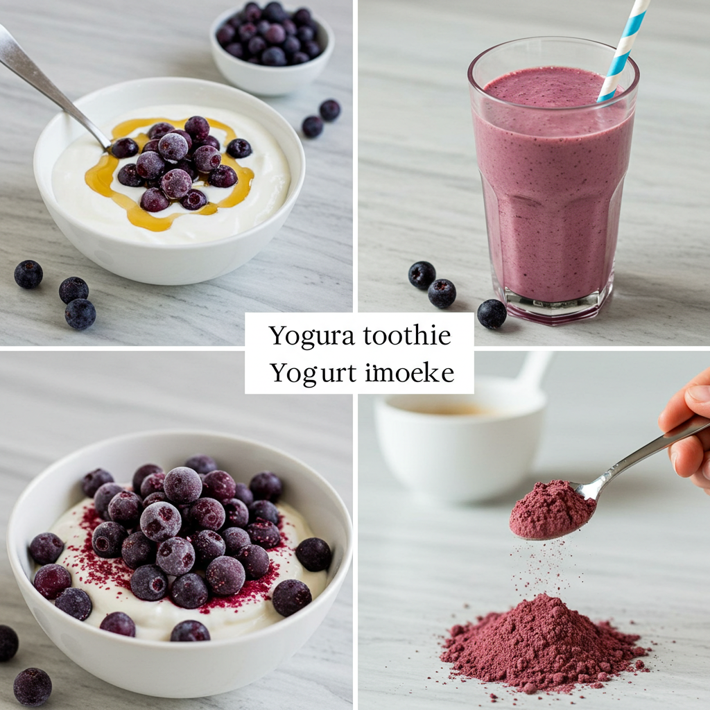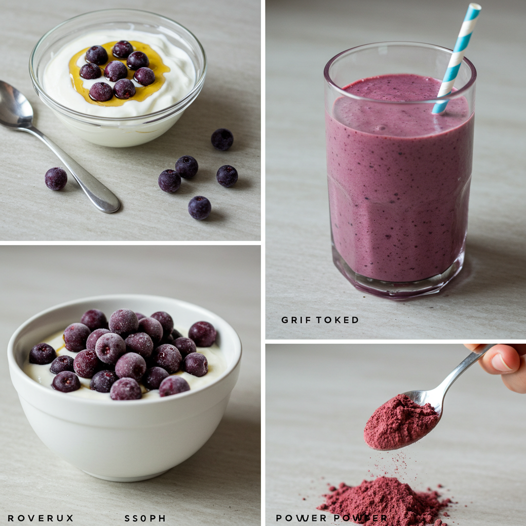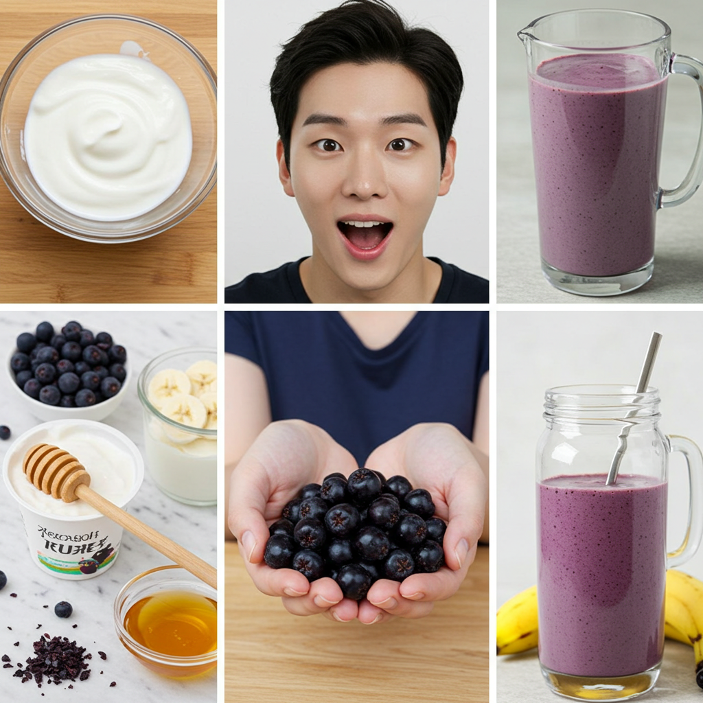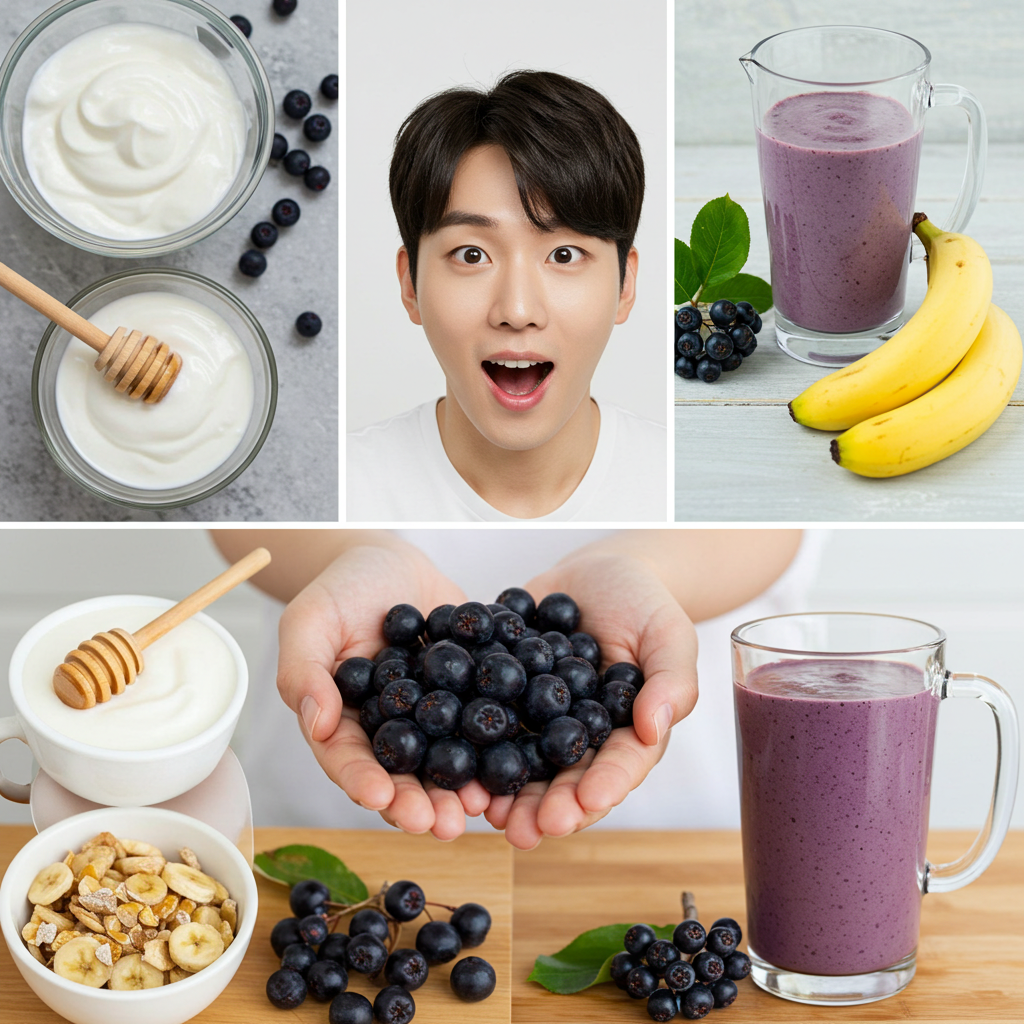 - 아로니아 스무디: 냉동 베리 70g + 바나나 1/2개 + 플레인요거트 150g + 물/우유 50ml.