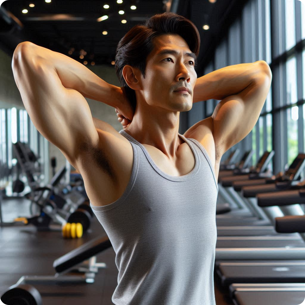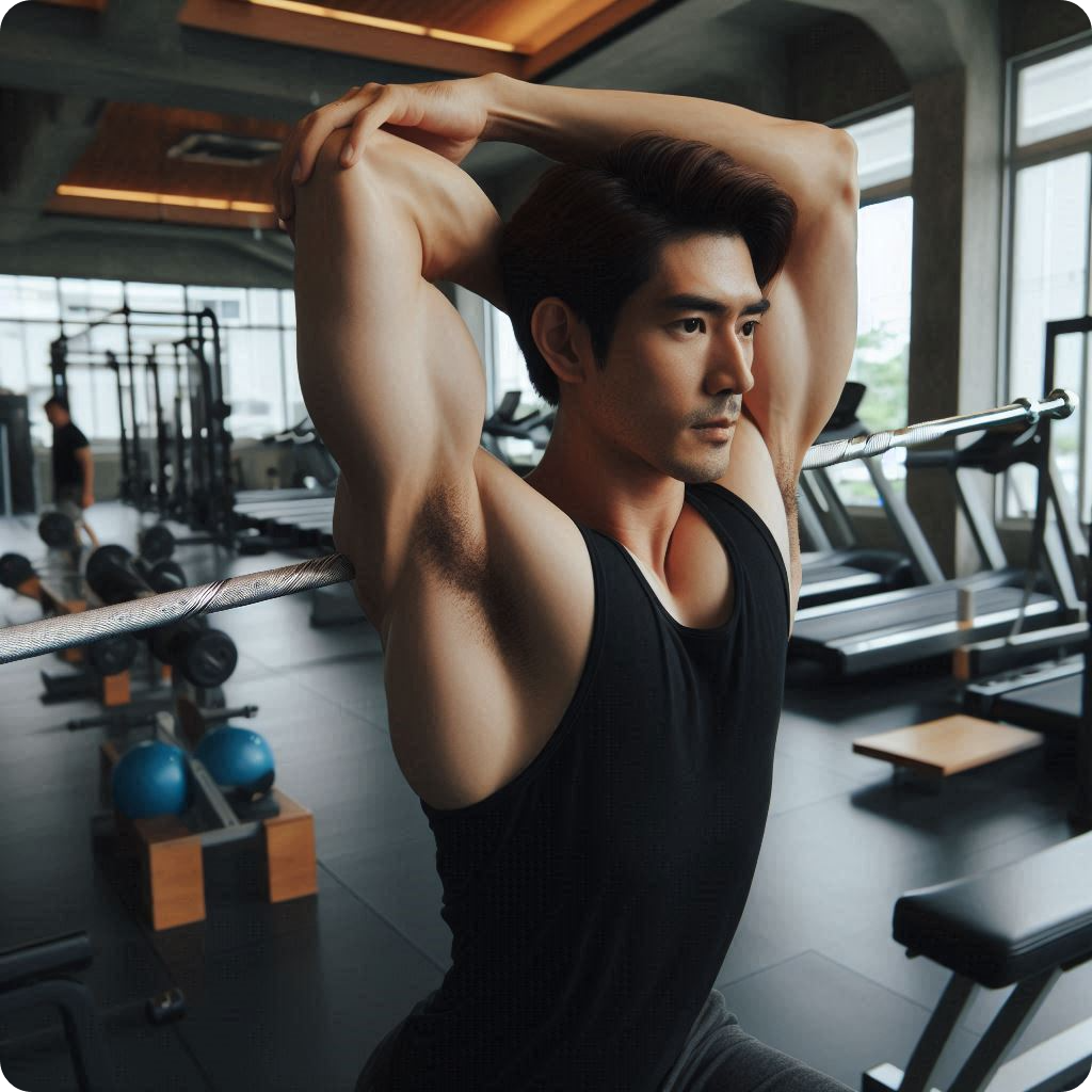 가벼운 막대를 잡고 머리 위로 올렸다 내리거나 옆으로 돌리며 어깨를 부드럽게 움직입니다.
