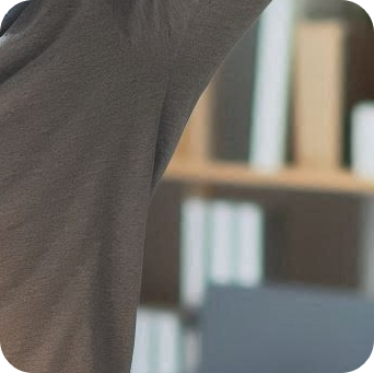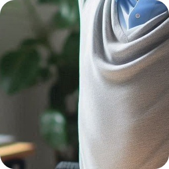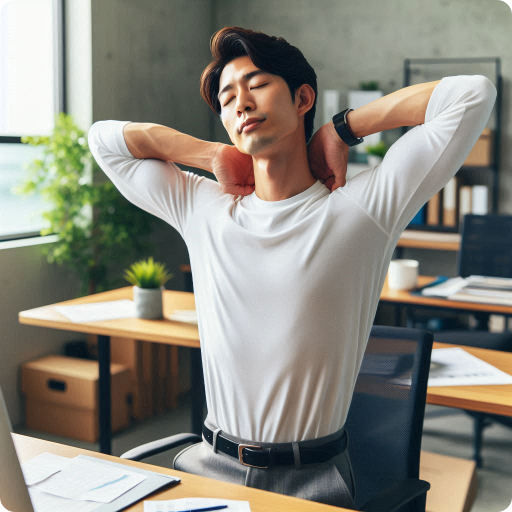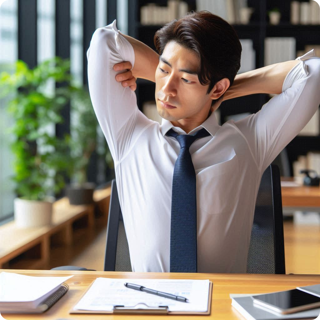테이블에 팔꿈치를 대고 앉아 몸을 뒤로 빼며 어깨 관절을 늘립니다.