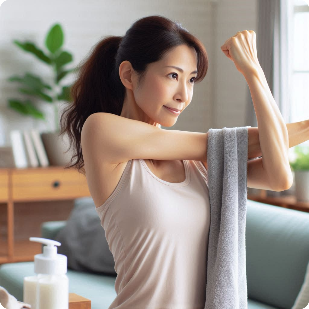 수건을 등 뒤로 잡고 건강한 팔로 위에서 잡아 당기며 아픈 팔의 가동 범위를 늘립니다.