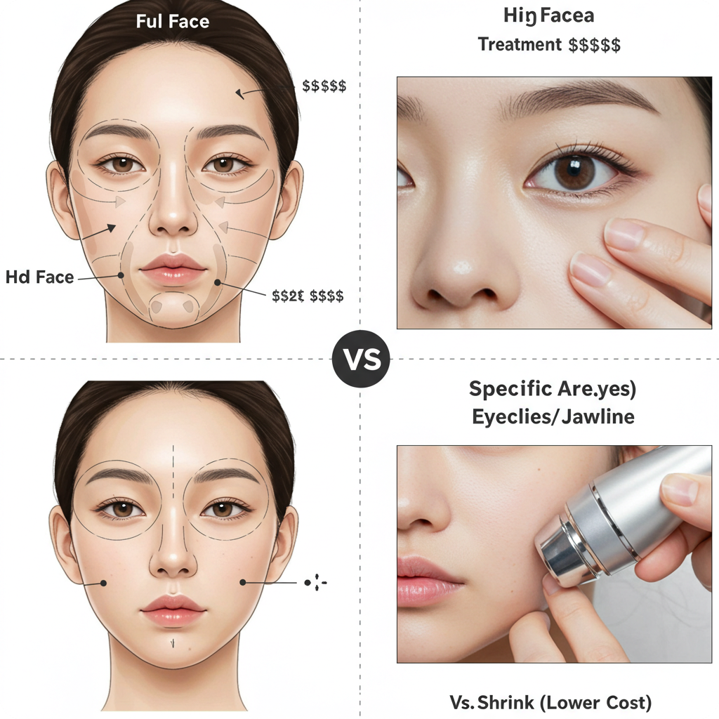 연 1회 강도 높게 or 6~9개월 간격 보완형 등 계획에 따라 달라집니다. 본인 예산을 정하고 필수 부위(턱선/이중턱)와 선택 부위(눈가·미세처짐)를 나눠 설계하면 비용 효율이 좋아집니다.