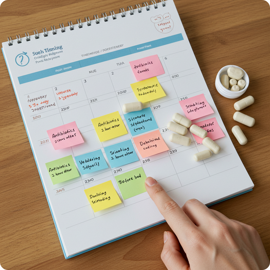 특히 항생제, 위산 억제제, 철분제 등과는 2시간 이상 간격을 두는 것이 좋습니다.