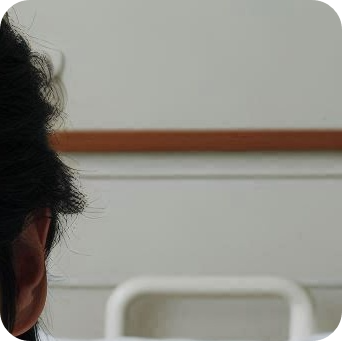 ① 침대에 앉아 머리를 45도 반대 방향으로 돌립니다.
