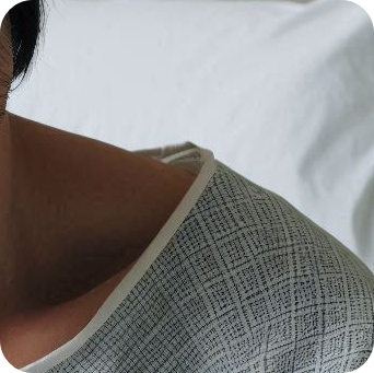① 침대에 앉았다가 옆으로 누우면서 머리를 위로 45도 돌립니다.