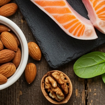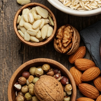 호두, 아몬드, 아마씨, 치아씨드에는 불포화지방산과 오메가3가 풍부하여 혈중 지방 균형을 맞추는 데 도움이 됩니다.