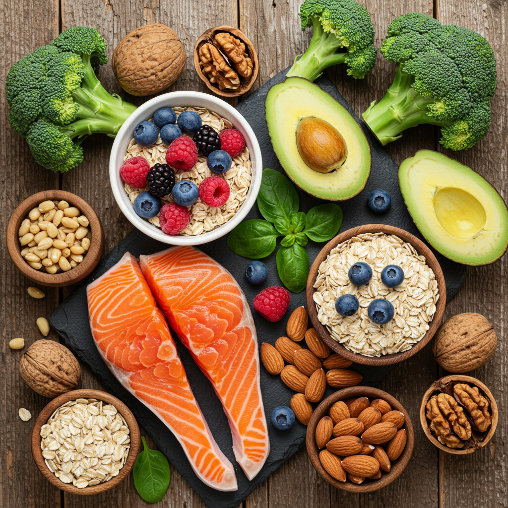 식이섬유가 풍부한 채소와 과일은 혈중 콜레스테롤 흡수를 억제합니다. 특히 사과, 오렌지, 베리류, 브로콜리, 시금치 등이 도움이 됩니다.
