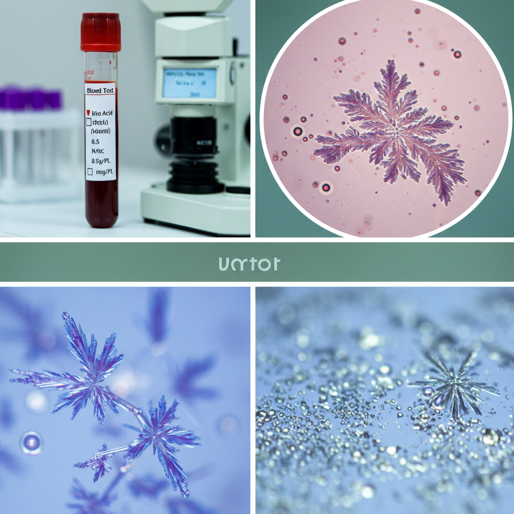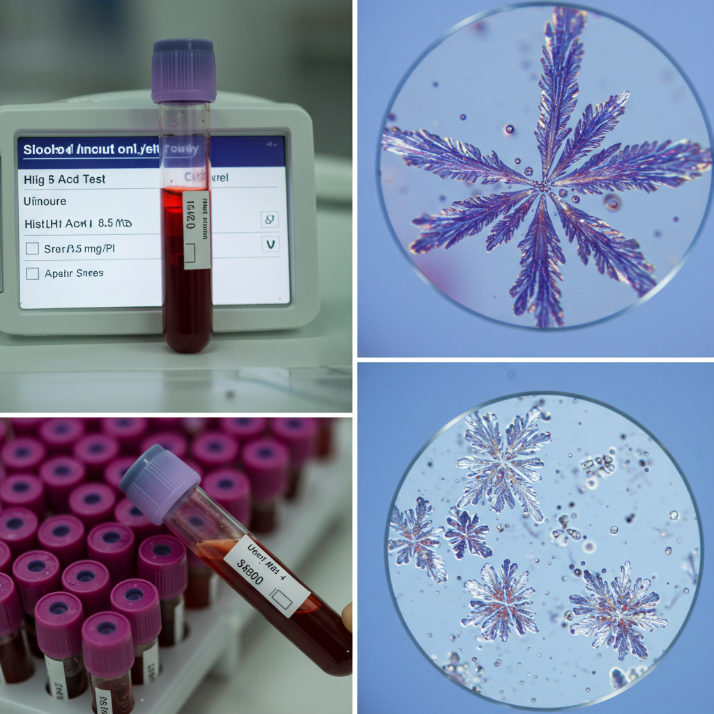 공복 혈액검사로 요산 수치를 확인합니다. 다만 발작 시점에는 일시적으로 정상일 수 있어 반복 측정이 필요합니다.