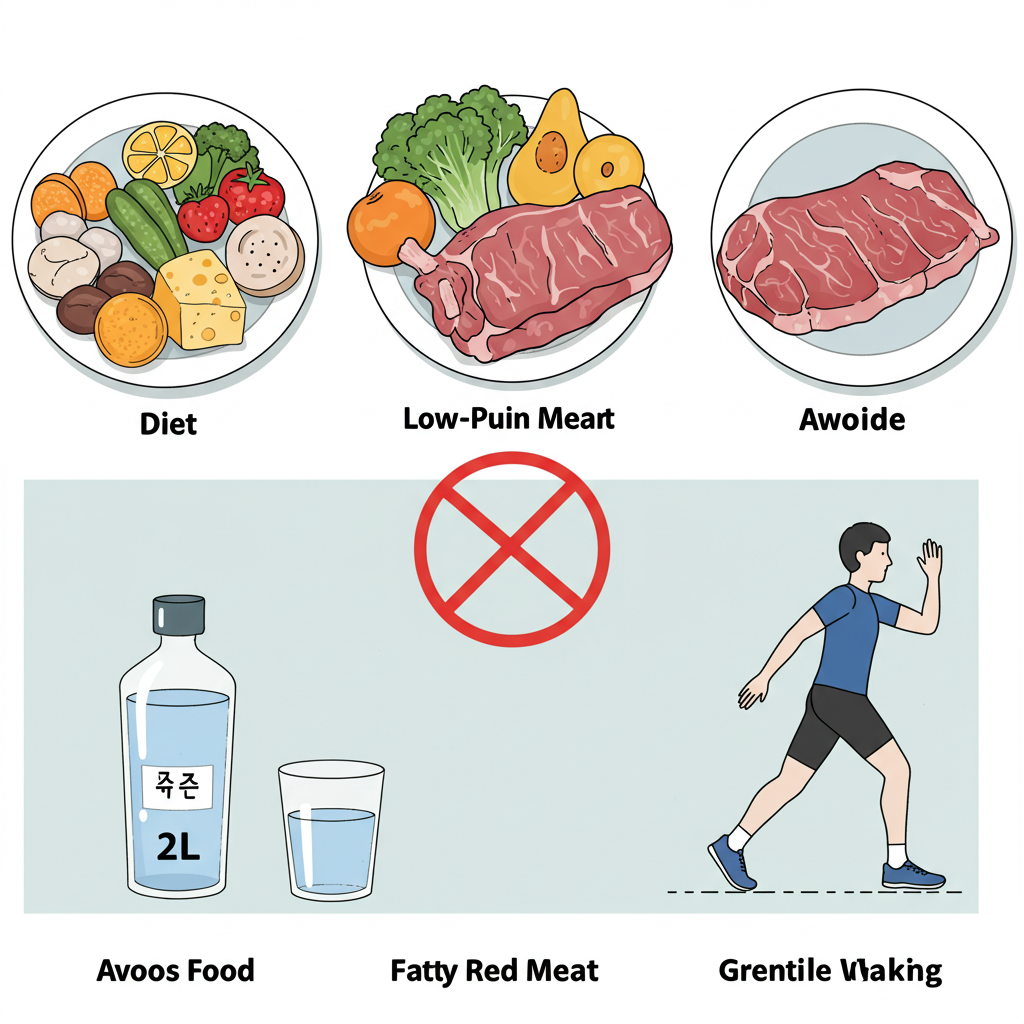 충분한 수분은 요산 배설을 돕습니다. 급성기에는 해당 관절 휴식·거상·냉찜질로 통증을 낮추고, 아급성기에는 온찜질·가벼운 관절 가동으로 회복을 촉진합니다.