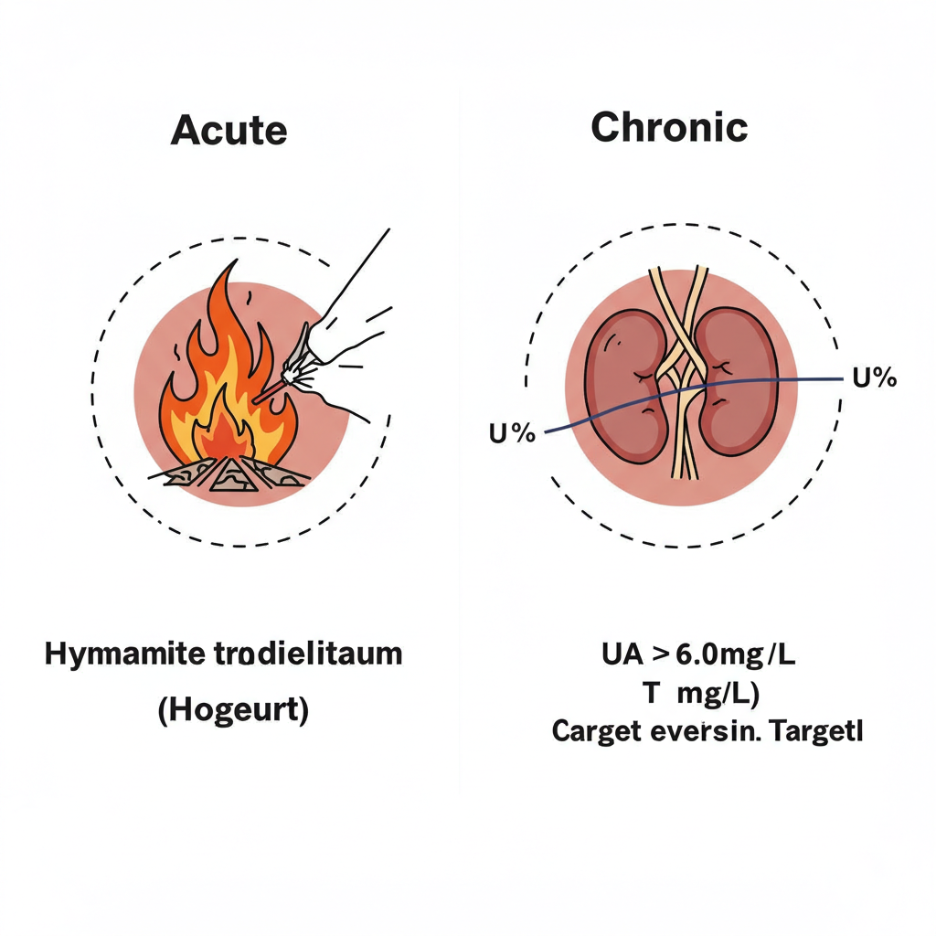 (1) 급성기 통증·염증 조절, (2) 만성기 요산 관리(재발 예방).