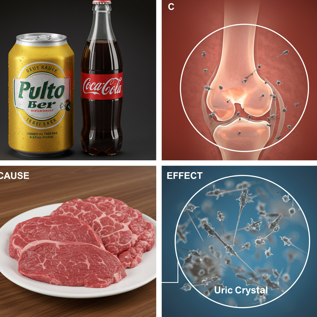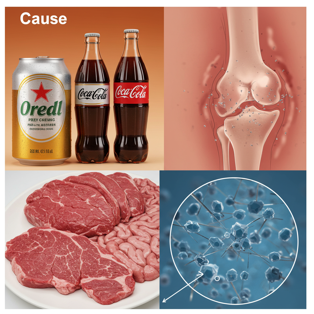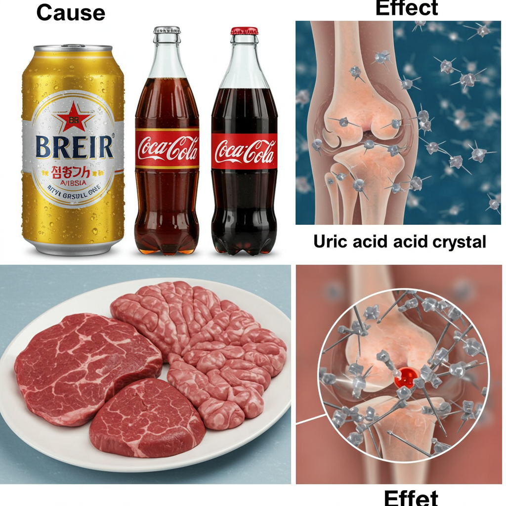 요산은 퓨린 대사 산물입니다. 유전적 소인, 비만, 과음(특히 맥주·증류주), 과당 음료, 고퓨린 식품(내장·붉은 고기·일부 해산물), 신장기능 저하 등이 요산을 높입니다.