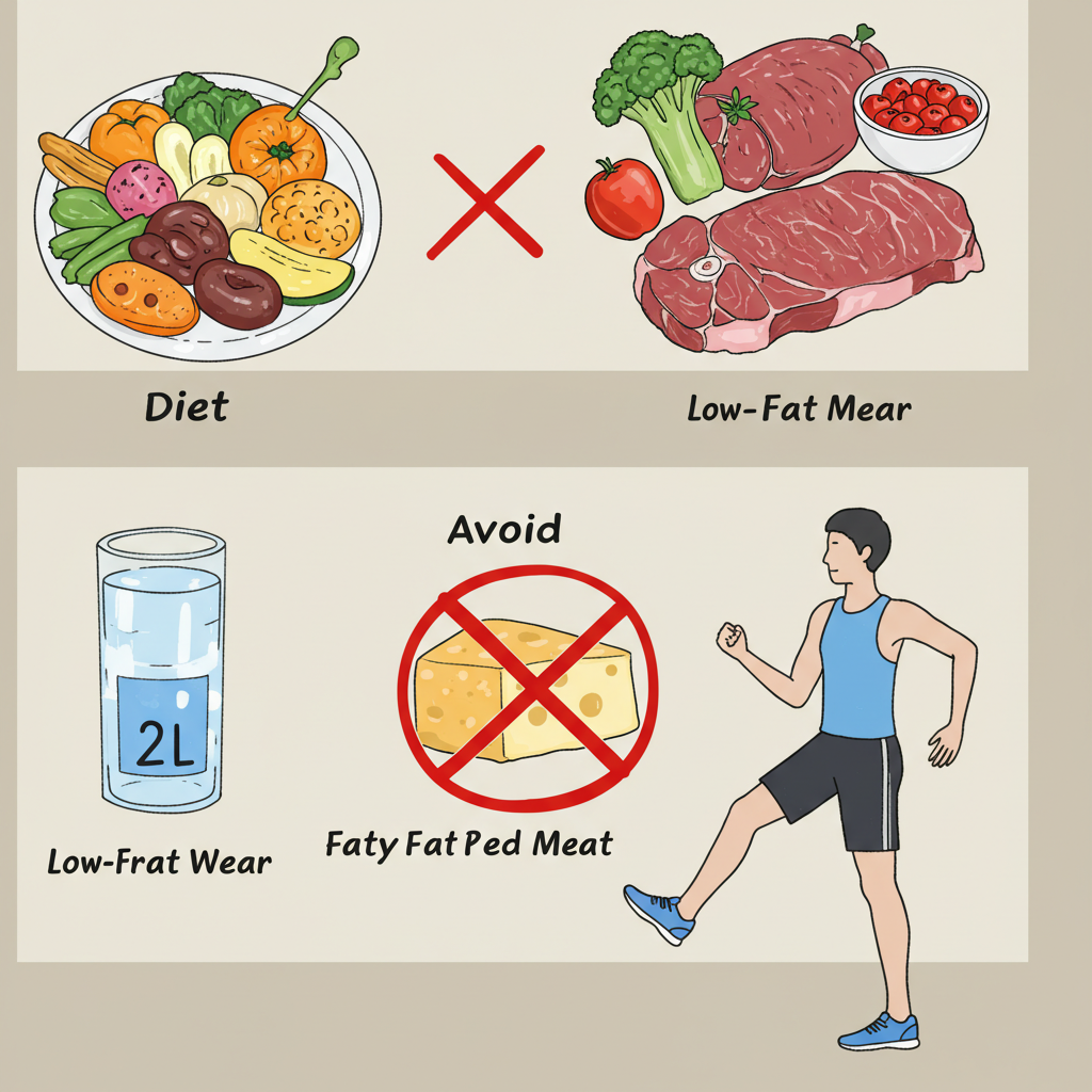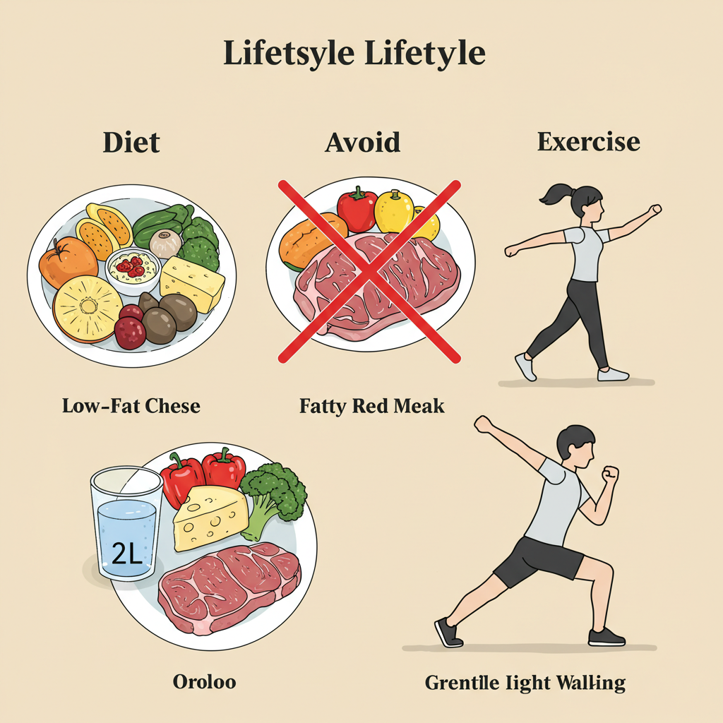 점진적 체중감량, 규칙적 걷기·근력운동, 수면·스트레스 관리가 요산 저감에 도움이 됩니다. 금주 또는 엄격한 절주가 핵심입니다.