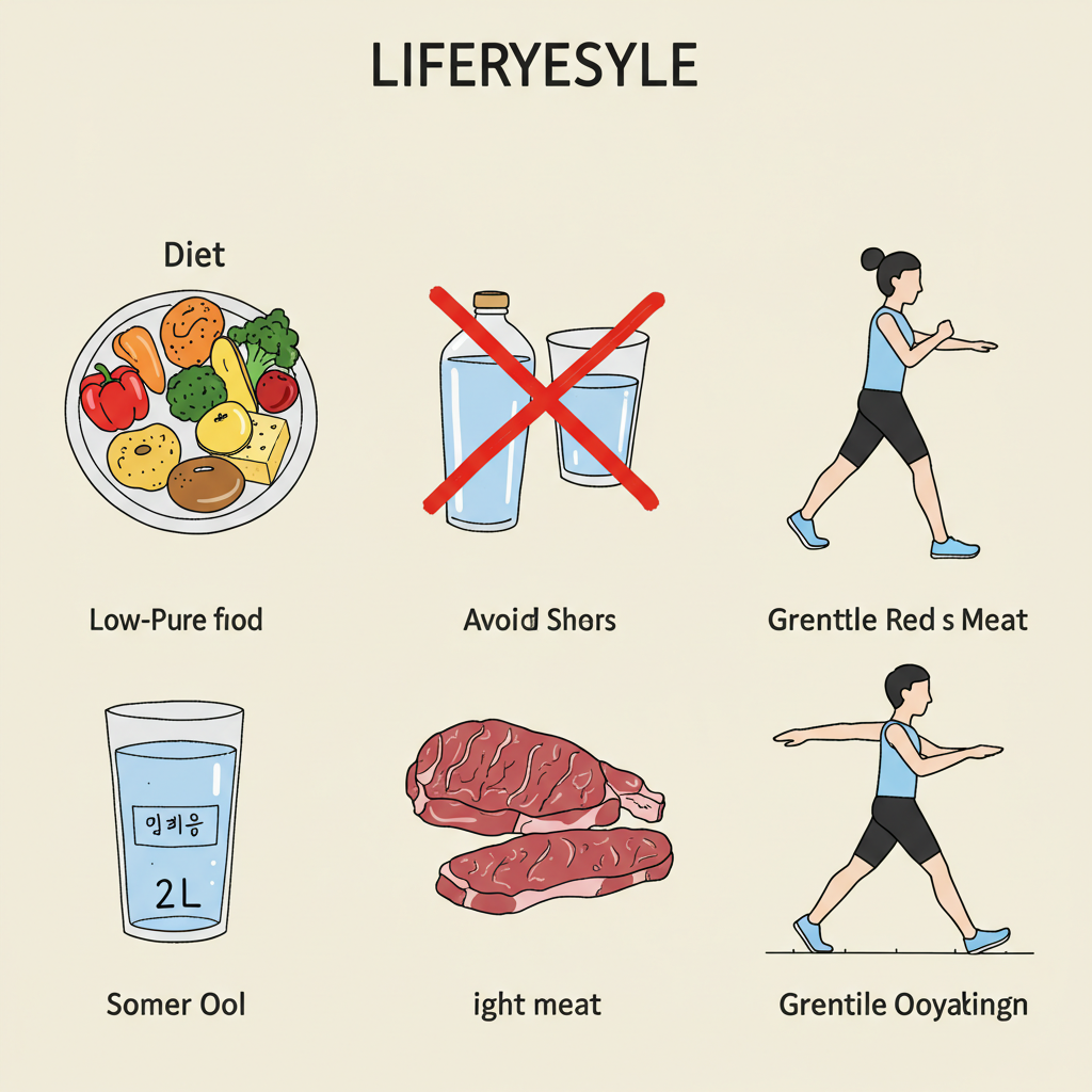 - 주의: 붉은 고기·내장·멸치·정어리 등 고퓨린 식품, 과당 음료, 과음(특히 맥주)