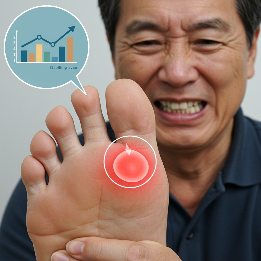통풍은 혈중 요산이 높아지면서 관절에 요산 결정(요산염)이 침착되어 염증과 격렬한 통증을 일으키는 질환입니다. 주로 엄지발가락 관절에서 시작하지만 발목, 무릎, 손가락 등으로도 번질 수 있습니다.