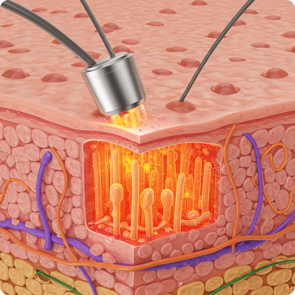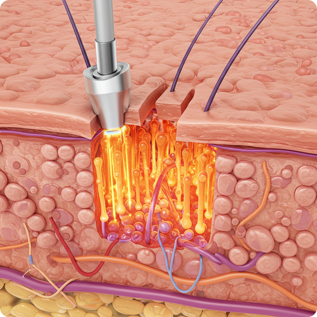 프락셀은 피부에 미세한 열기둥(Microthermal Zone)을 촘촘히 만들어 손상·재생을 동시에 유도하는 분획 레이저입니다.