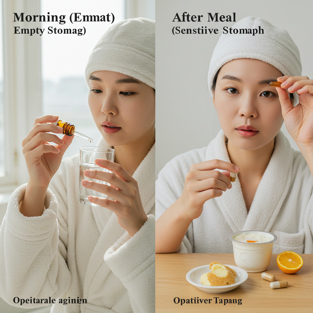 아침 공복에 섭취하면 흡수율이 높아 효과적입니다.